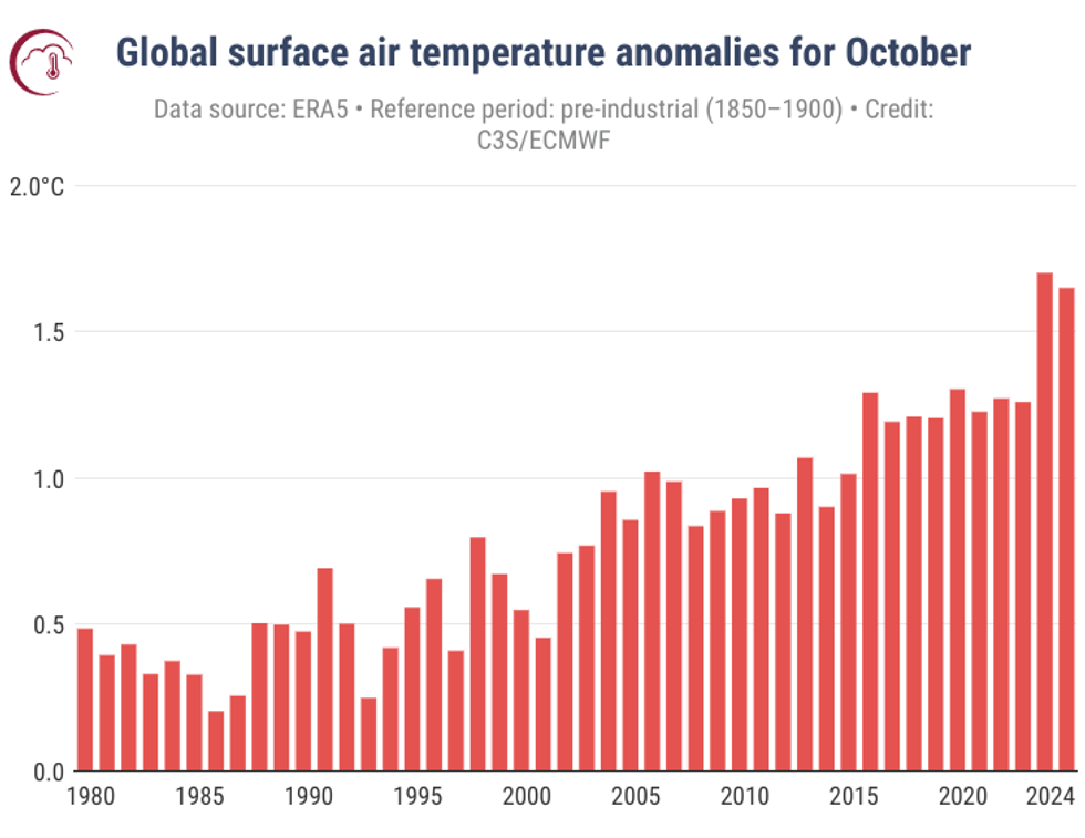 It is “virtually certain” that 2024 will be the warmest year on record, according to the European Copernicus Climate Change Service. In October, the global average surface air temperature was about 60 degrees Fahrenheit, or nearly 3 degrees Fahrenheit warmer than pre-industrial averages for that month. This year is also on track to be the first entire calendar year in which temperatures are more than 1.5 degrees Celsius above pre-industrial levels. “This marks a new milestone in global temperature records and should serve as a catalyst to raise ambition for the upcoming climate change conference,” said Copernicus deputy director Dr. Samantha Burgess.