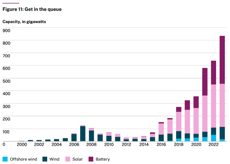 Former U.S. Vice President Al Gore’s green asset management business, Generation Investment Management, put out its eighth annual Sustainability Trends Report this week. The paper is packed full of interesting insights (both uplifting and depressing), but one stands out. It says upgrading the power grid is “the critical issue to get the energy transition moving faster in the big, developed economies.” It includes this graphic showing the cumulative backlog of renewable-energy projects wanting to connect to the grid in the U.S.: