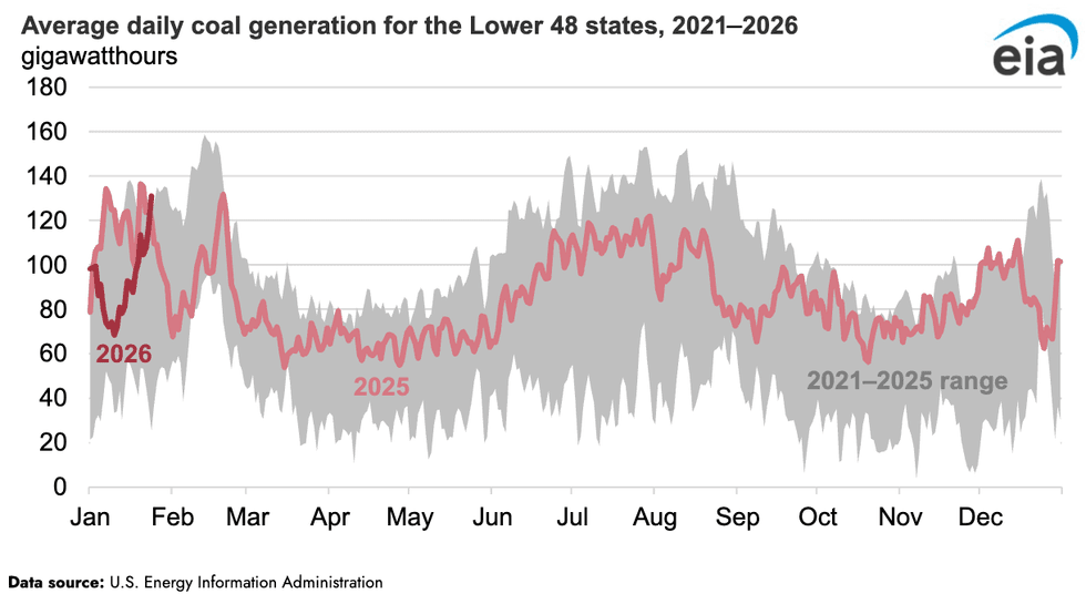 Coal-fired electricity generation in the Lower 48 states soared 31% last week compared to the previous week amid Winter Storm Fern’s Arctic temperatures, according to a new analysis by the Energy Information Administration. It’s a stark contrast from the start of the month, when milder temperatures led to lower coal-fired power production versus the same period in 2025. Natural gas generation also surged 14% compared to the previous week. Solar, wind, and hydropower all declined. Nuclear generation remained nearly unchanged.
